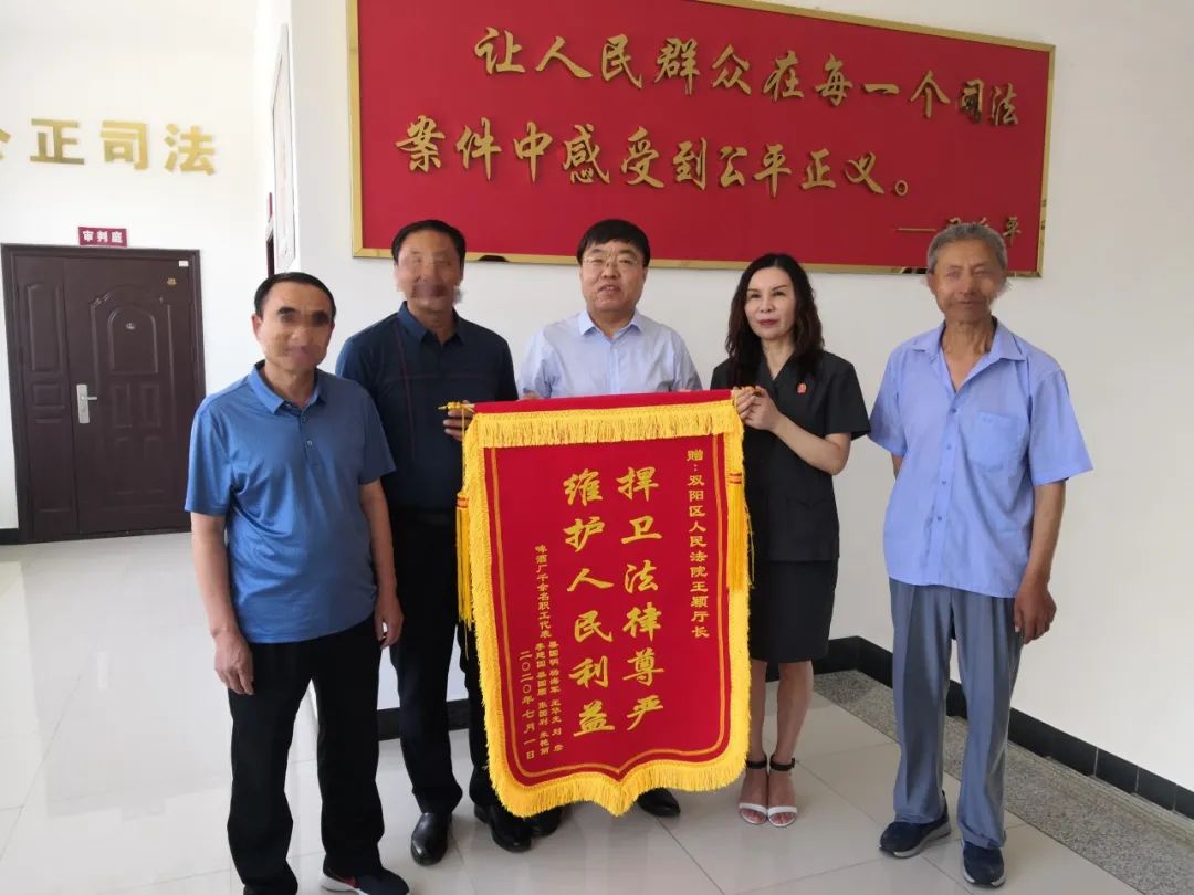 20年7月16日上午10时许,室外温度高达34度,原双阳区银瀑啤酒厂职工栗某某、刘某等一行6人顶着炎炎烈日手持红彤彤的锦旗走进了山河人民法庭的大门,经安保人员询问,该一行6人是代表啤酒厂上千职工给山河人民法庭赠送锦旗。