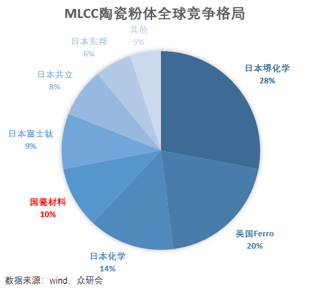 作为国内MLCC陶瓷粉体龙头,经过多年的产品工艺技术积累,国瓷材料在全球的市场占有率已经达到10%。国瓷材料是继日本堺化学之后国内首家、全球第二家成功运用水热工艺批量生产纳米钛酸钡粉体的厂家,也是中国大陆地区规模最大的批量生产并对外销售MLCC配方粉的厂家。MLCC电子陶瓷材料全球超过70%的份额由日本企业垄断,国瓷材料经过多年辛勤耕耘市占率达到10%,在国内,国瓷材料占据70%以上的市场份额。