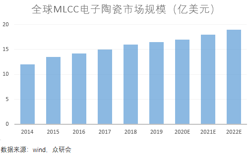 MLCC电子陶瓷材料的市场规模近年来保持平稳增长,2019年全球市场规模约17亿美元。预计未来将保持5%左右的增长速度,到2022年增长至约19亿美元。