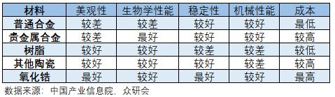国瓷材料的生物医疗材料主要是牙科用氧化锆材料,氧化锆是一种耐高温、耐腐蚀、耐磨损和低热膨胀系数的无机非金属材料,国瓷材料主要生产高端纳米氧化锆材料,目前主要应用于陶瓷义齿和智能穿戴设备领域,占比分别约为90%和10%。氧化锆在美观性、生物学性能、稳定性、机械性能上都具有较好的表现,优于其他材料,被作为义齿的最佳选择,但是价格较为昂贵,随着老龄化的加剧,人均收入的提高,氧化锆义齿的渗透率将不断提高。