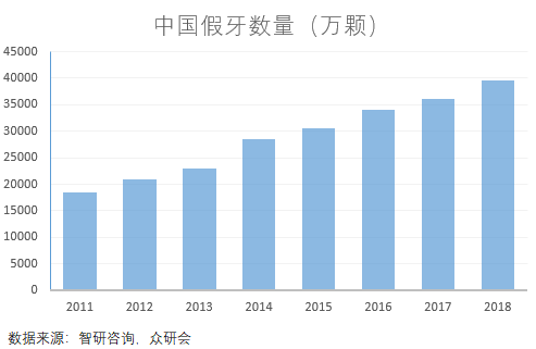 我国义齿市场规模高速增长,随着老龄化的加快,18年,60岁以上人口占比17.9%,19年60岁以上人口占比达到18.1%,同比提升0.2%,预计2020-2024年中国义齿市场将由93.8亿元增长至170.1亿元,GAGR16.05%。我国2017年义齿产量达到3.6亿颗,种植牙市场仅占义齿市场1.61%,市场规模不到20亿元,距离美国10%的比例差距非常大,未来具有5倍的提升空间。