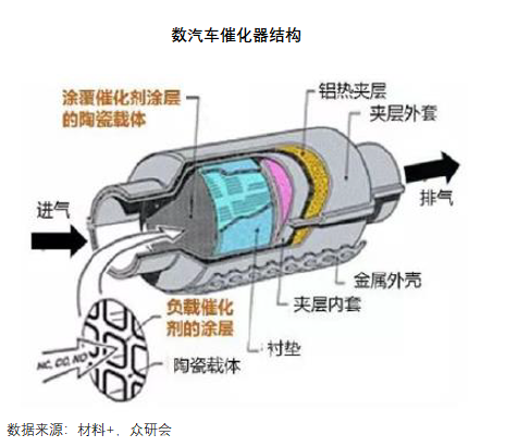 汽车尾气净化器主要分为四部分:载体、涂层、助剂和活性组分。载体通常以蜂窝陶瓷为主;涂层以氧化铝为主;助剂以铈锆固溶体为主;活性组分一般附着在分子筛上,是催化剂核心部分,汽油车以铂铑钯三效催化剂为主,柴油车以钒基催化剂为主。目前全球催化剂市场基本被国外企业垄断,蜂窝市场美国康宁,日本NGK,日本电装等国外厂商占据了90%以上的份额,分子筛国外企业巴斯夫和、庄信万丰、优美科占据了70%以上的份额。