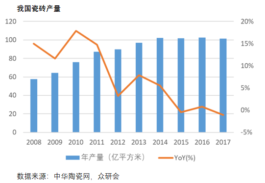 陶瓷墨水下游市场主要是建筑材料行业的墙、地砖,以及潜在的卫浴陶瓷、功能陶瓷薄膜领域。自2014年以后,我国瓷砖产量趋于稳定,均保持在100亿平方米。国内目前国瓷材料和道氏技术两家合计的市场占有率达到50%,而国产瓷砖由于价格优势以及工艺的不断提升,瓷砖市场不断的向国产企业集中。