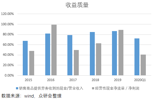 国瓷材料的现金收入比基本在80%左右波动,说明其收款能力比较差,上边我们已经分析过国瓷材料的应收账款比例比较高,下游议价能力偏弱,同时国瓷材料业务拓展方向较多,扩张比较快,收益质量偏低。