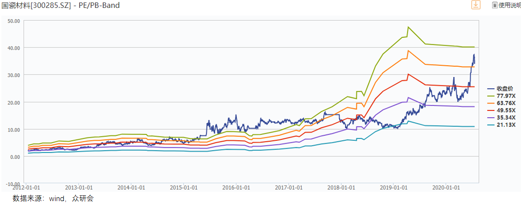 选取电子陶瓷粉和MLCC制造企业三环集团,牙齿医疗企业大博医疗和电子新材料企业雅克科技作为可比公司,取可比公司2019年静态市盈率。同时结合公司历史估值水平,给予公司53倍的PE,国瓷材料在2020/2021/2022年的合理股价为30.74/40.28/47.17元。