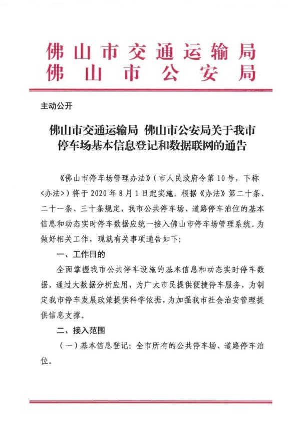 原标题:《佛山市交通运输局、佛山市公安局关于我市停车场基本信息登记和数据联网的通告》