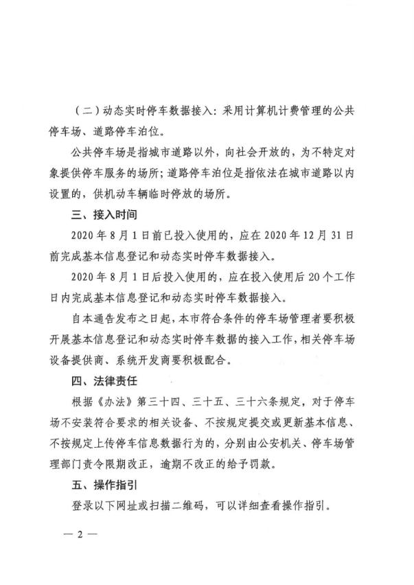 自本通告发布之日起,本市符合条件的停车场管理者要积极开展基本信息登记和动态实时停车数据的接入工作,相关停车场设备提供商、系统开发商要积极配合。