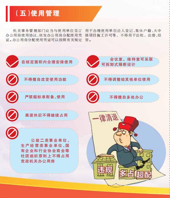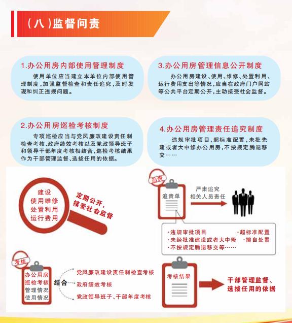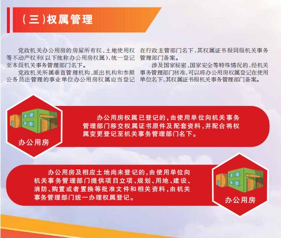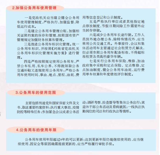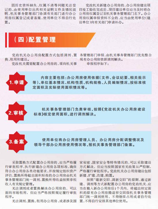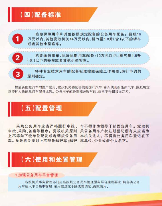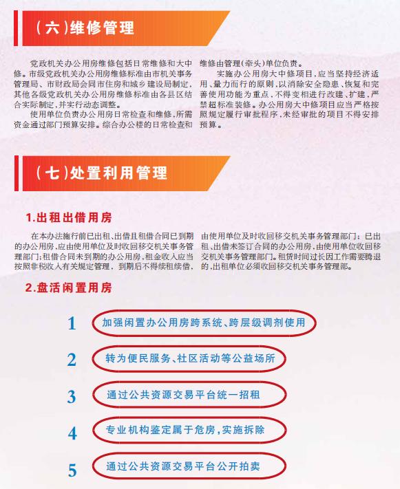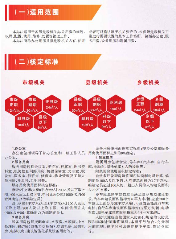 在党政机关办公用房管理方面,“两个办法”细化了配置申报、使用权登记、临时机构办公用房调剂腾退等程序,并明确了办公用房使用范围、面积核定标准、安全管理责任等方面的要求;在党政机关公务用车管理方面,明确了编制核定、使用原则、配备更新程序、分类处置程序,对推进公务用车标识化、信息化管理工作提出了具体要求。同时,对公务用车申报、审批、购置、备案等具体组织实施流程作了进一步规范、细化和完善。
