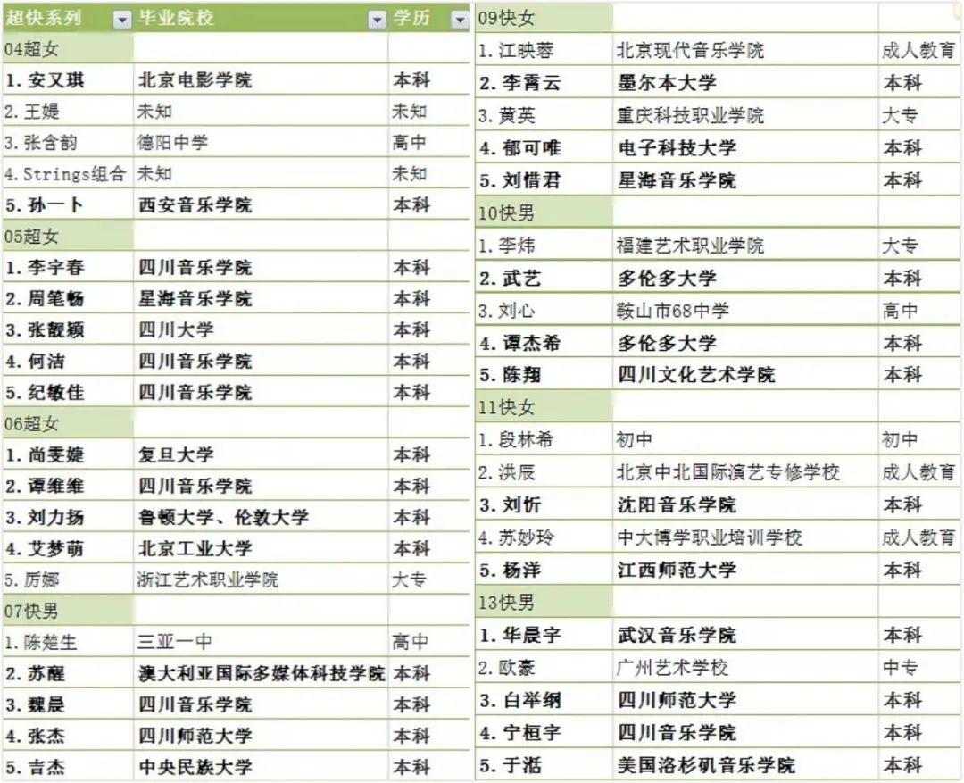 可以看到,选秀偶像早期多为艺术院校本科毕业,超女快男中"xx音乐学院"为多,其中四川音乐学院为偶像市场输送了李宇春、何洁、谭维维、魏晨、邓典等多位选手,堪称内娱选秀的"黄埔军校"。此外,周笔畅、刘惜君来自星海音乐学院,华晨宇毕业于武汉音乐学院,均是所谓"科班出身"的参赛者。