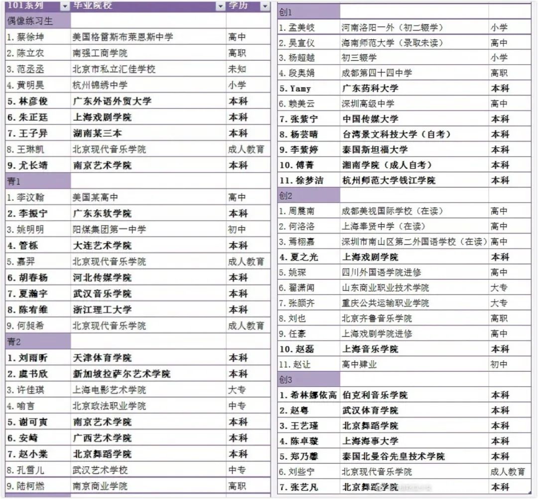 比如,头部偶像经纪公司乐华的艺人学历普遍偏低,孟美岐初二辍学,黄明昊则是小学学历。火箭少女被网友称为"101系学历最低女团",除了孟美岐,初三辍学的杨超越也只有小学文凭。创2出道的R1SE,11人中只有2人是本科学历。