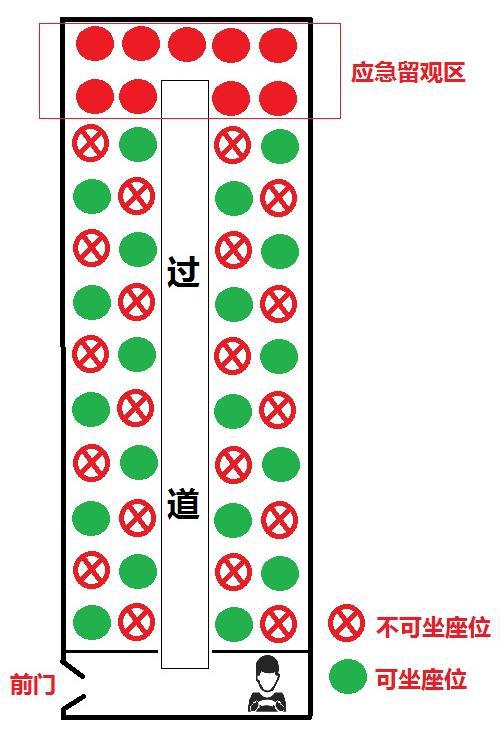 为减少交叉感染风险,疫情防控期间控制客座率,车辆荷载减半。车厢后部预留两排座位供应急处置使用。上车后请配合管理人员引导,按照标识分散间隔就坐。(分散就坐示意图见下文)