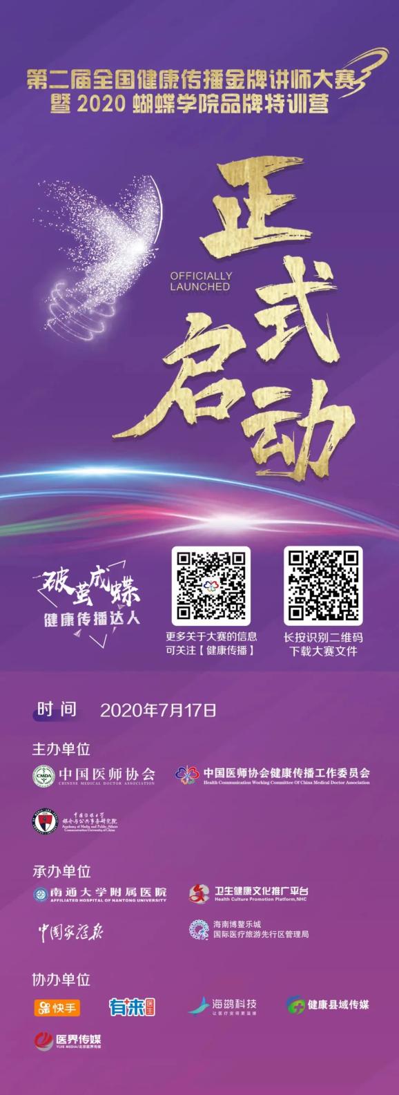 为继续在全国广泛遴选和孵化健康传播新媒体人才,加速推进“基层健康传播能力提升工程”,中国医师协会、中国医师协会健康传播工作委员会于2020年7月正式启动第二届全国健康传播金牌讲师大赛暨2020蝴蝶学院品牌特训营。同步启动“蝴蝶.健康”优秀健康科普作品百强赛。