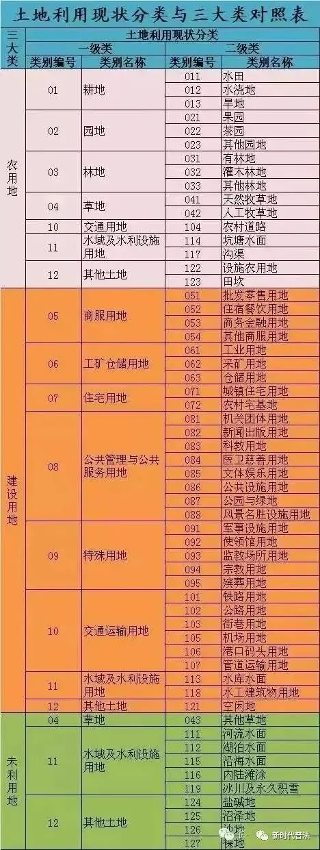 《土地利用现状分类》国家标准采用一级、二级两个层次的分类体系,共分12个一级类、57个二级类。其中一级类包括:耕地、园地、林地、草地、商服用地、工矿仓储用地、住宅用地、公共管理与公共服务用地、特殊用地、交通运输用地、水域及水利设施用地、其他土地。《中华人民共和国土地管理法》与《土地利用现状分类》中类别的对照关系如下表: