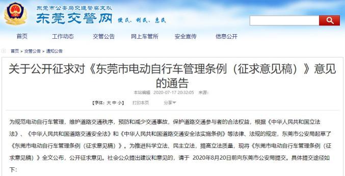 为规范电动自行车管理,维护道路交通秩序,预防和减少交通事故,保护道路交通参与者的合法权益,近日,东莞市公安局起草了《东莞市电动自行车管理条例(征求意见稿)》(以下简称《意见稿》),向社会公开征求意见。市民可在8月20日前提出建议和意见。