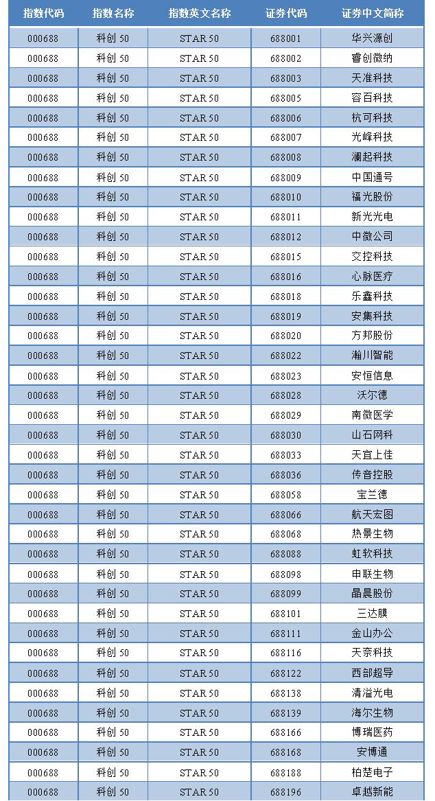 近日,上交所发布公告,为集中体现科创板核心上市公司股价表现,将推出“上证科创板50成份指数”(简称“科创50”),代码是“000688”。名单中显示,“科创50”由50只个股组成,华兴源创、睿创微纳、天准科技、容百科技、杭可科技、光峰科技、中国通号等均位列其中。