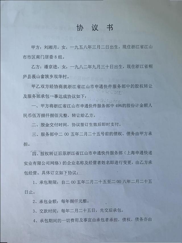 协议还规定,股权转让后原江山市申通快件服务部(上海申通快递实业有限公司网络)企业名称及经营者姓名即进行变更,由潘京进承包经营。