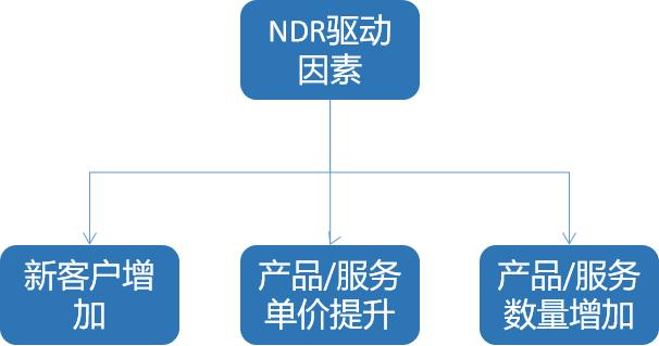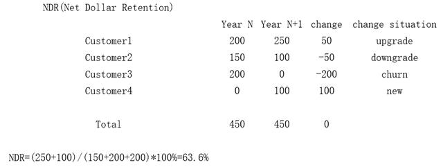 源源不断的订阅收入能够为企业提供可观的现金流水平,作为衡量反映收入的留存水平的NDR,只有当留存率超过100%并不断提高,订阅业务才有持续的保障,质量也会更高。NDR并不是一个企业必须披露的规范性指标,因此不同公司的计算选取的客户群体、计算指标以及口径等多少会有些许不同,但是总体而言反应了一家公司从上一计算期的客户身上获取的收入提升程度,NDR指标简单来讲定义如下:NDR=(beginning revenue + upgrades – downgrades - churn)/beginning revenue,其中Upgrade相当于增购订阅数,即加购(产品数量增加)或者升级服务(原有产品或服务升级导致单价提升)所增加的收入,Downgrade代表与Upgrade相对应的减项,churn则代表客户纯流失造成的收入减少。如下表所示,以第N年时的customer1、2、3客户群为基础,在第N+1年时将仍以这个客户群为基础而产生的收入去除以第N年时其产生的收入,就可以得到NDR值为55.6%,意味着公司在第N+1年从customer1、2、3得到的钱仅为第N年的55.6%。