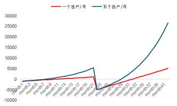 此外NDR指标的好坏是促使公司不断进行投资升级并提升效率的的重要因素。结合累计现金流曲线可见,假设前期每个月获得一个客户,获客成本为1100,则每月每客户可收回100元(此处暂不考虑客户流失),当企业走出第一个现金流低谷,曲线开始上扬时,正是二次投资,获得更多客户的最佳时机。这将导致第二个现金流低谷迅速到来,并且比第一个低谷更深,企业进入五个客户/月模型后,会产生更陡峭的增长率,但是,想要进入第二个扩大模型,必须先将第一阶段的成本收回并获得一定现金流才可,这是早期的一个特殊挑战。而NDR的放大左右能够有效改变公司发展斜率,下图中的蓝线表示每个月相较于上个月对原有客户增加10%的收入,可见仅10%的NDR增长可以将企业原本需11个月才能到达的盈亏平衡点提升到约7.75个月即可收回成本,这意味着约30%的效率提升,且每月获客规模越大,绝对收益越高,因此高NDR不仅可以促进公司扩大投资,开发新产品,更可以使得公司赚更多的钱。