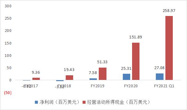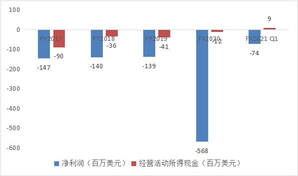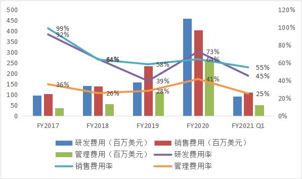 Slack收入增速自上市以来有所下降,FY2018-FY2020同比增长分别为110%,82,57%,至FY2020收入规模达6.3亿美元。Slack精准定位客户需求,免费模式的付费转换率高达30%,目前Slack还未盈利,FY2017-FY2020年净亏损分别为1.47亿美元、1.40亿美元、1.39亿美元以及5.68亿美元,亏损率在FY2020有所扩大。Slack的持续亏损与高企的运营成本分不开,FY2017-FY2019研发费用率分别为92%、64%、39%、73%,销售费用率分别为99%、64%、58%、64%,随着Slack付费用户数的不断增长,为了继续扩大市场,成本支出或还将继续增长,此外,即时办公通讯软件与zoom类似本就处于一个竞争激烈的环境,因此对研发成本也提出了更高的要求,继续走高的成本支出,将对Slack的盈利能力进一步产生压力,此外经营性现金流处于亏损逐渐收窄阶段,2021财年第一季度净利润转亏为盈。