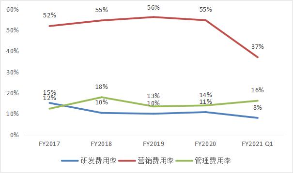 zoom收入来源基本上是订阅服务收入,并不自行出售硬件设备,根据订阅服务型企业的发展规律来看,ZOOM上市以来的表现已经远超预期,上市不到一年就拜托亏损状态,收入增速虽然逐年放缓,但是相比视频会议行业平均10%左右的增速上来看仍然是十分高的增速,同时净利润和现金流的快速增长支撑起ZOOM的股价。费用端来看,为获取新客户ZOOM将近50%的营销费用率符合SaaS企业前期的发展规律,Zoom在研发和管理费用率方面控制较低,研发费用率较低的原因是Zoom有相当一部分员工部署在中国,人工成本相较于美国略低。在客户扩张和美元净扩张率方面也非常符合Zoom作为独角兽企业市场对它的预期,2021财年第一季度美元净扩张率达130%以上,大客户数的增长符合收入增长的趋势。
