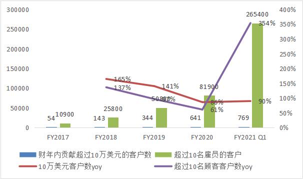 任何一家saas公司其实都很难从同一个客户身上每年收取120%以上的收入,简单算个账两年后从同一家企业身上将获得近144%的收入也可知,除非公司产品有重大改善或者是推出新产品,但是此过程是从长期角度来看的,并没有连续的可持续性,因此短期究其原因是依靠客户数的增长在支撑,一方面从存量提高现有行业渗透率,另一方面拓展新客户数量。因此,当公司仍处在现有竞争市场中用尽一切手段不断挖掘更多客户是一直要做的事情,更多客户以为着更多合同和收入,更多新客户意味着下一期可能会有更好看的收入留存率,也意味着当形成“病毒式营销”手段能够发挥更大价值从而降低营销费用,这也意味着更低的成本,更高的投资收益率,一切看起来都很好。近期一个典型的例子就是zoom,由于疫情带动远程视频会议赛道的快速发展,实质上是通过几乎为0的获客成本获取了大批用户,加上其本身是对传统硬件视频会议市场的挑战,疫情期间股价上涨了200%以上,合理预计至少在未来几年业绩都会比较亮眼,而同是专注于工作场所的远程协作办公的slack表现就稍显逊色,2021Q1季报中zoom和slack分别披露了其净收入留存率水平,为130%(基于超过10名客户)以及138%,从这个指标来看似乎slack还优于zoom,但部分原因还是出在客户身上。