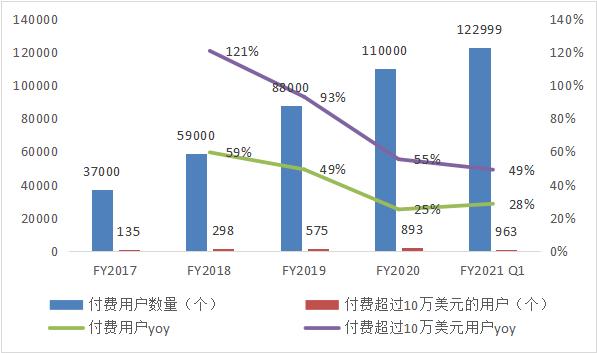 Slack净收入净留存率于2021财年第一季度呈反弹上升趋势,其客户性质与zoom更类似,客户数量较多但是有相当一部分来自中小企业客户群,且客户数增速低于总体客户ARPU增速,因此新老客户客单价差距不显著大约在1.5倍左右。然而由于Slack来自Teams的竞争压力较大,根据此前第三方机构测算Slack流失率约为10%,由此算得的LTV/CAC约为4.2,这就直接导致虽然Slack收入留存率还处于比较高的状态但是LTV/CAC相比zoom比较低,另一方面销售以及研发费用率的居高不下使得Slack同时面临来自财务方面的压力,从而导致股价下降。
