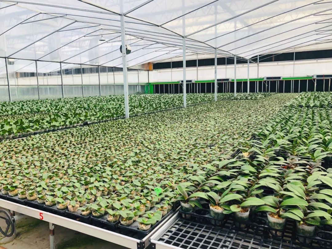 经过近10年的发展,园区已建成蝴蝶兰产业中心超千亩,蝴蝶兰品种达300余种。高档薄膜温室、玻璃温室、高端输美温室、引入台湾的新品种、新技术……这里更形成了围绕兰花的新品种研发、生产种植及成花销售而打造的全链条产业集群,让进驻的花商“足不出户”就能进行资材采购。