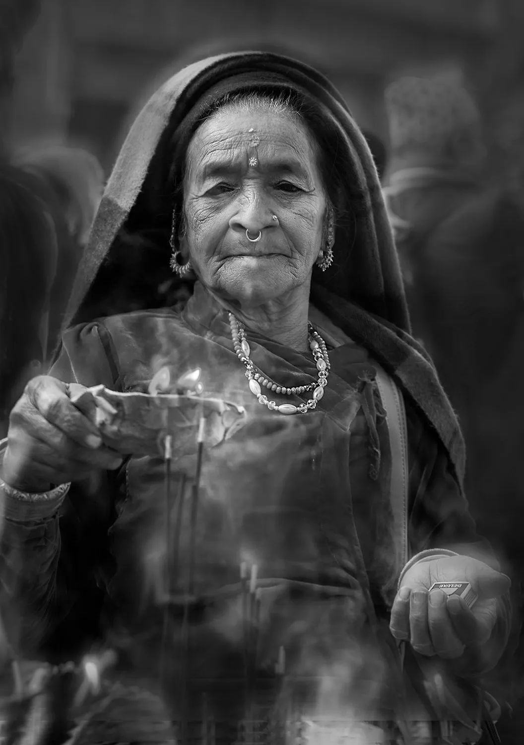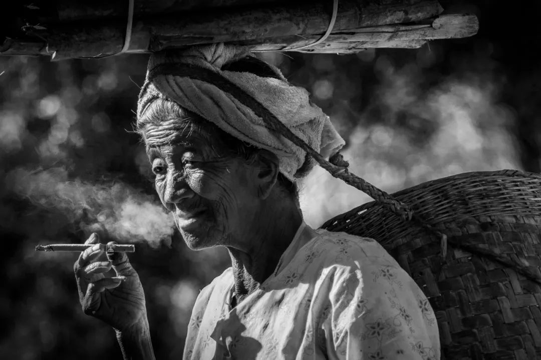 在缅甸茵莱湖的茵黛村佛塔群的小路上,不时的有野狗、牛群和劳作的人通过。我们的目光集中到一个老妇人身上,她头上顶着干柴、身上背着重物,潇洒地抽着烟,那饱经风霜的脸上流露出满足的表情。