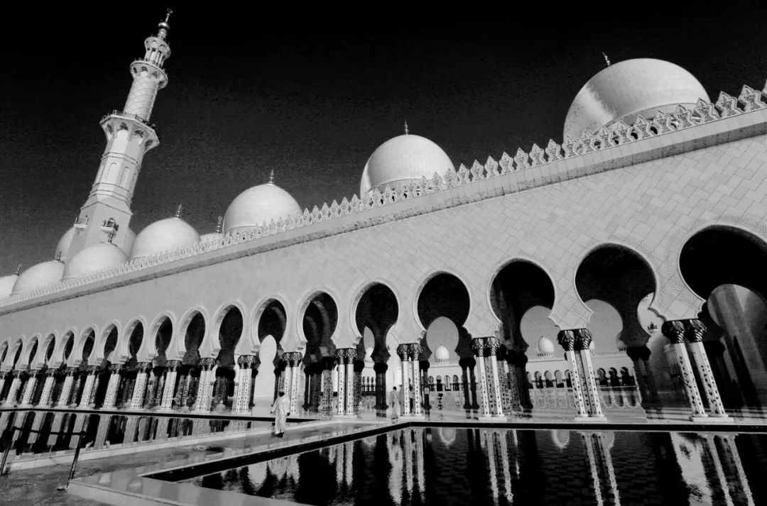 阿布扎比大清真寺,坐落于阿联酋首都阿布扎比市,是阿联酋的标志性建筑。她于2007年的古尔邦节竣工,对公众开放。是阿联酋七酋长国最大、全世界第八大的清真寺。清真寺占地2.2万平方米,设计有82个圆形穹顶,主穹顶高85米,装饰着黄金的柱子多达1100根。清真寺最多可容纳4万穆斯林人同时做祷告。地板上的色彩不是颜料彩绘,而是用天青石、红玛瑙、紫水晶、鲍鱼贝等天然材料拼构而成。清真寺耗资55亿美元,仅黄金就用去了46吨,整个建筑群都用来自希腊的汉白玉包裹着,非常的庄严肃穆。而那些精美的雕刻则是来自中国工匠的手艺。