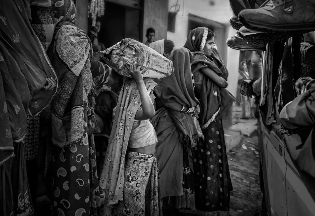 印度的交通拥堵现象时分严重,大城市的车辆堵塞是十分显著的一个问题,而且长期以来都得不到解决,小城市的交通拥堵也日益加剧。印度交通的另外一个问题就是运力不足,挂火车、挂汽车、挂嘟嘟车的现象随处可见。图片为等待上汽车的妇女和儿童。