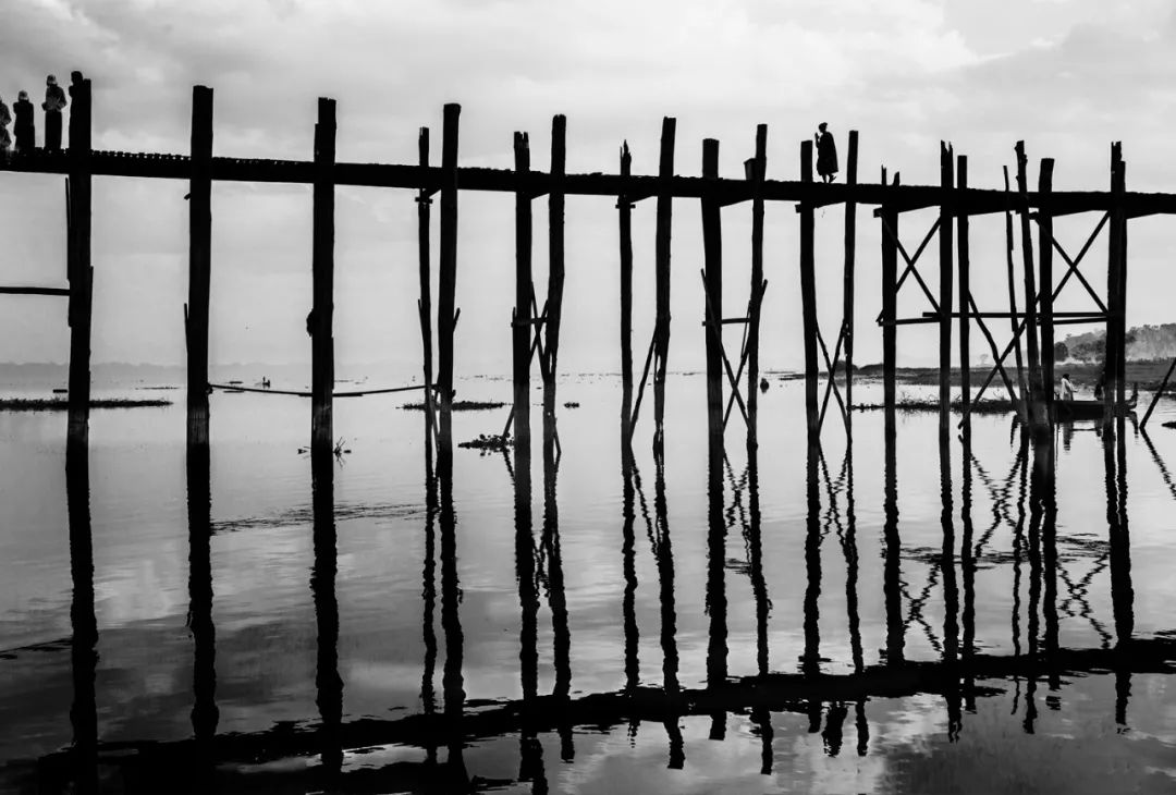 乌本桥长达1200米,是世界上最长的柚木桥。桥墩、桥梁、铺桥的木板都是用珍贵的柚木。修建于贡榜王朝的敏东王时期。乌本桥十分出名,因为它是全部由柚木搭建,百年不倒。在乌本桥边观日出,静静地欣赏,细细地体会雄伟的建筑与大自然的完美结合。乌本桥还有情人桥之称,我看到几对情侣静静的坐在低矮的木桩上,相互依偎看着太阳升起的地方,他们认为这里可以见证爱情,浪漫的乌本桥。每当夕阳西下,乌本桥被落日的余晖染成橘黄色,加上湖边枯木的剪影,更显得意味深长。