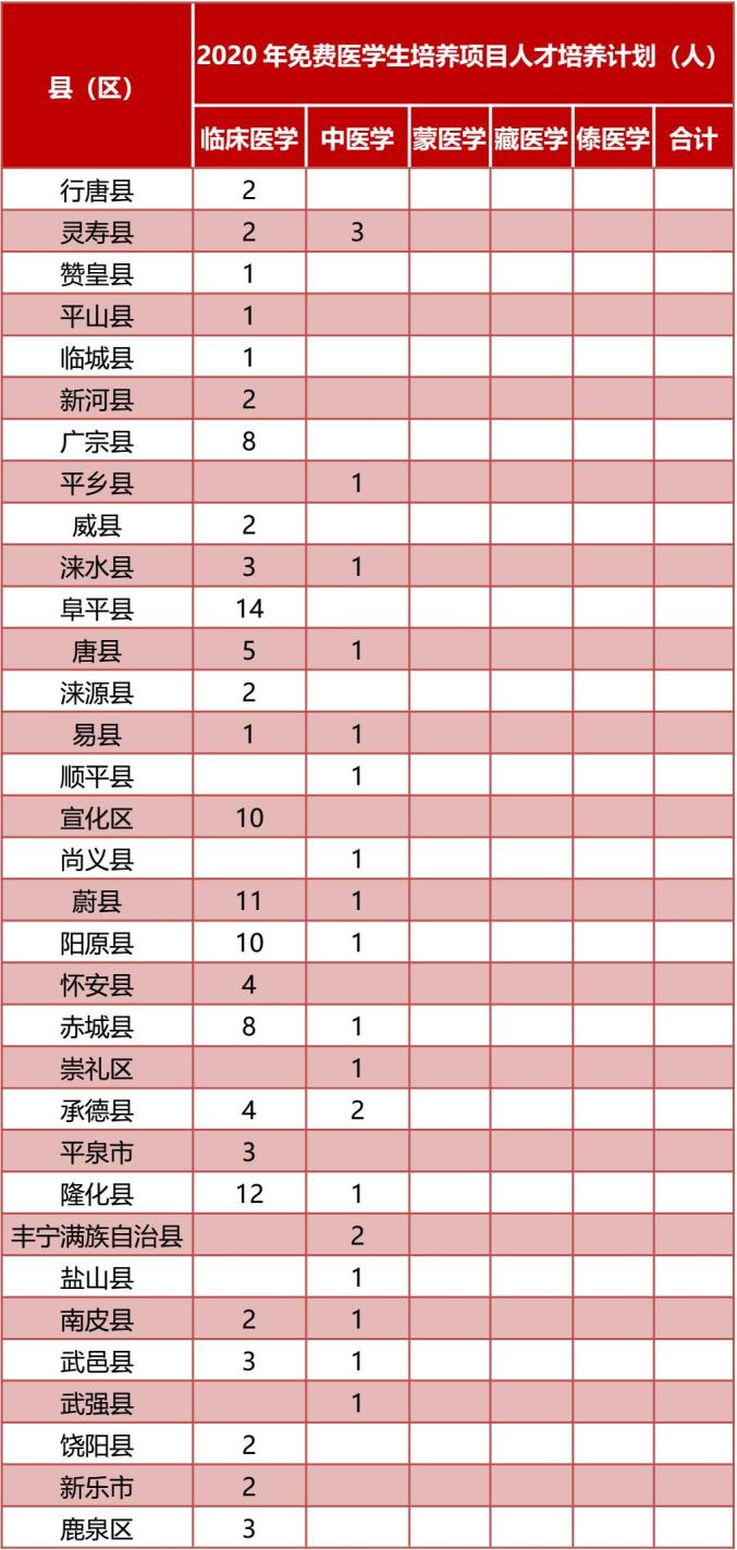 专科层次免费医学定向计划,由沧州医学高等专科学校、承德护理职业学院、邢台医学高等专科学校和廊坊卫生职业学院承担。