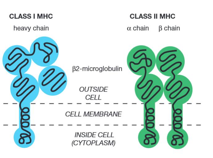 MHC分子有两类,即MHCⅠ类分子和MHCⅡ类分子。MHCⅠ类分子在机体大多数细胞表面都有分布,但是数量上却有很大的差别。MHCⅠ类分子就像是一块广告牌,告知杀伤性T细胞这些细胞内部的情况。例如,当一个人体细胞被病毒感染后,病毒蛋白的片段——多肽就会装载到MHCⅠ类分子上,并被运输到病毒感染细胞表面。通过检查这些被MHCⅠ类分子展示的蛋白片段,杀伤性T细胞可以用其受体窥探到这些细胞内部的情况,发现该细胞已经被病毒感染并且应该被消灭。