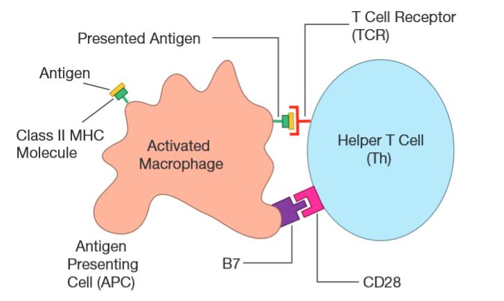 辅助性T细胞激活的第一步是识别被MHCⅡ类分子展示在抗原提呈细胞表面的同源抗原,但是仅识别“告示牌”上的同源抗原是不够的,激活还需要第二个关键信号。第二个信号是非特异性的,即对所有抗原均相同,它涉及到抗原提呈细胞表面的一个蛋白(B7),该蛋白与辅助性T细胞表面相应受体(CD28)结合时,就形成了第二信号。