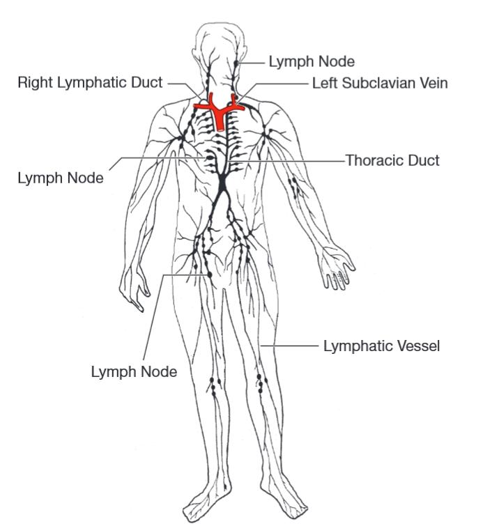 人体中的管道系统与此非常类似。我们体内有一套压力系统即心血管系统,血液在其中由心脏泵向全身各处。但人体还有另一套管道系统——淋巴系统,该系统是无压力的,其中引流的是由血管壁渗入组织中的液体,即淋巴液。如果没有这套系统,我们的组织就会充满液体,看起来就像 “面团宝宝(Pillsbury Doughboy)”一样。幸运的是,淋巴系统将下肢组织中的淋巴液收集于淋巴管中,并在肌肉收缩的影响下,通过一系列具有单向流动瓣膜的淋巴管,汇集于躯体上部。这些淋巴液以及来自于上部躯体左侧的淋巴液会被收集进入胸导管,进而汇入左锁骨下静脉,重新循环进入血液。同样的,来自于上部躯体右侧的淋巴液会被收集进入右淋巴导管,进而汇入右锁骨下静脉。在下面这张图中可以看到,淋巴液在回到血液的过程中,经过了一系列的中间站——淋巴结。