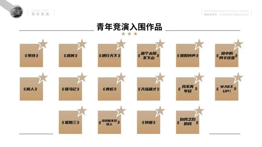 新曜星是果核的扶青舞剧板块,经过陕西大剧院舞蹈项目经理的筛选和邀请,下半年将有两部扶青舞剧在果核开演。疗愈舞剧《品》,将太极理论和东方审美的身体语言相结合,极具视觉美感。由豆瓣9.7分同名纪录片改编的舞剧《最后的棒棒》,将以接地气的小人物演绎出动人心弦的大情怀,致敬平凡却伟大的人们。你的梦想,闪闪发光。梦旅星是果核的青年竞演板块,也是果核宇宙中唯一拥有slogan的星球。在疫情最严峻的时刻,扶持青年创作者线上创作,勇敢发声,这才有了2020全国唯一青年竞演。青年竞演共有45支队伍报名,27支队伍进入评审,16支队伍入围。在接下来的日子,入围的16支队伍,将陆续在果核剧场演出。这场逐梦之旅,邀你一起畅游。