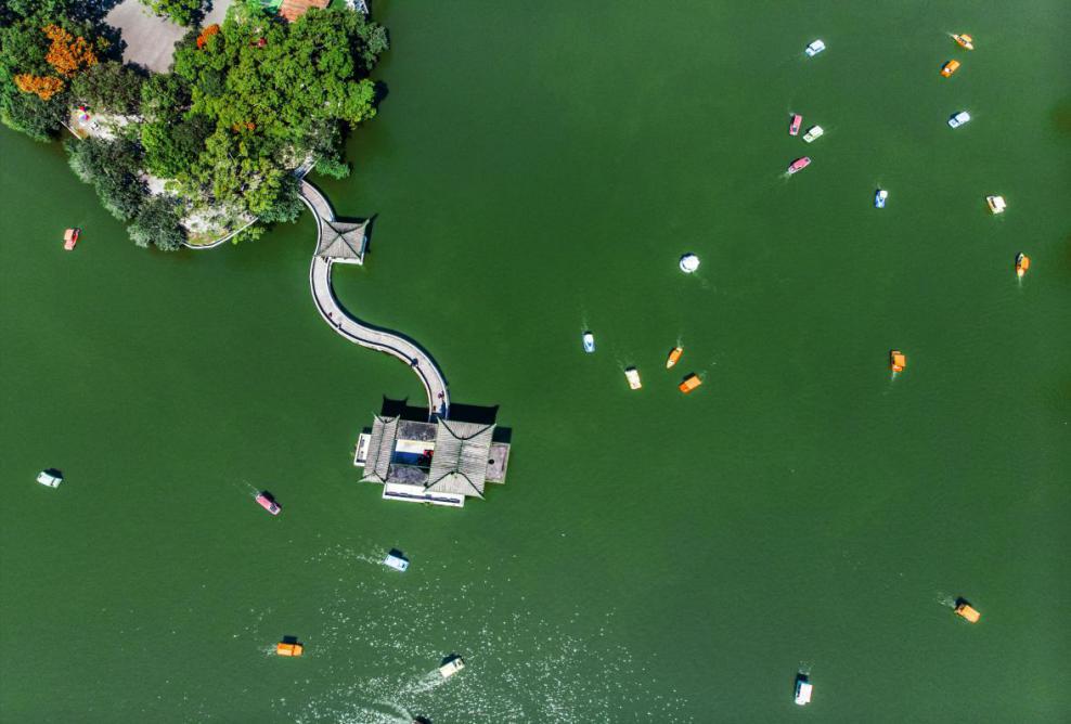 让人流连忘返的美景——湖心亭,自岸边由一条长廊弯曲延伸至大湖中心,在亭中可饱览整个天河湖优美的自然景色。