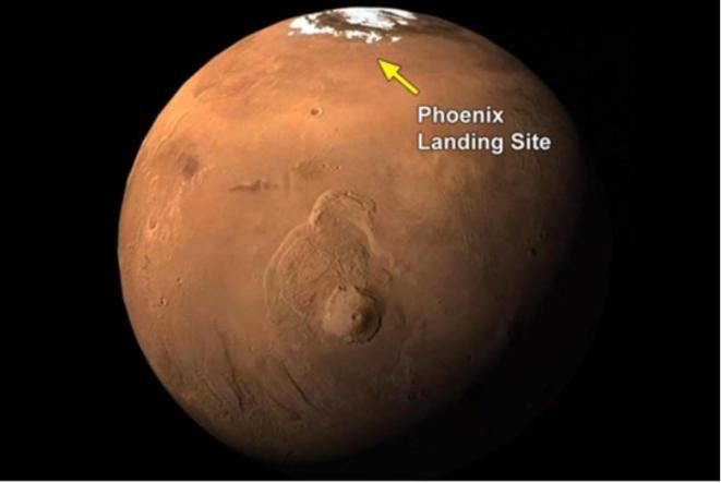 2008年5月美国“凤凰”号探测器在火星北极着陆。探测器考察两月后,科学家确认“凤凰”号在加热火星土壤样本时发现水蒸气,为火星有水找到证据。