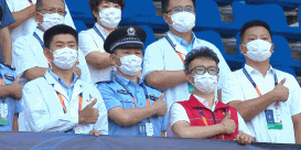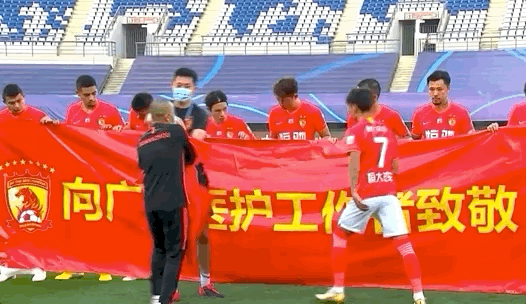大连市安排了22名特殊观众到现场观赛,他们都来自抗疫一线,有驰援武汉的英雄,也有基层社区工作者。他们在现场为比赛加油助威,并举出条幅:这场战“疫”一定能赢!