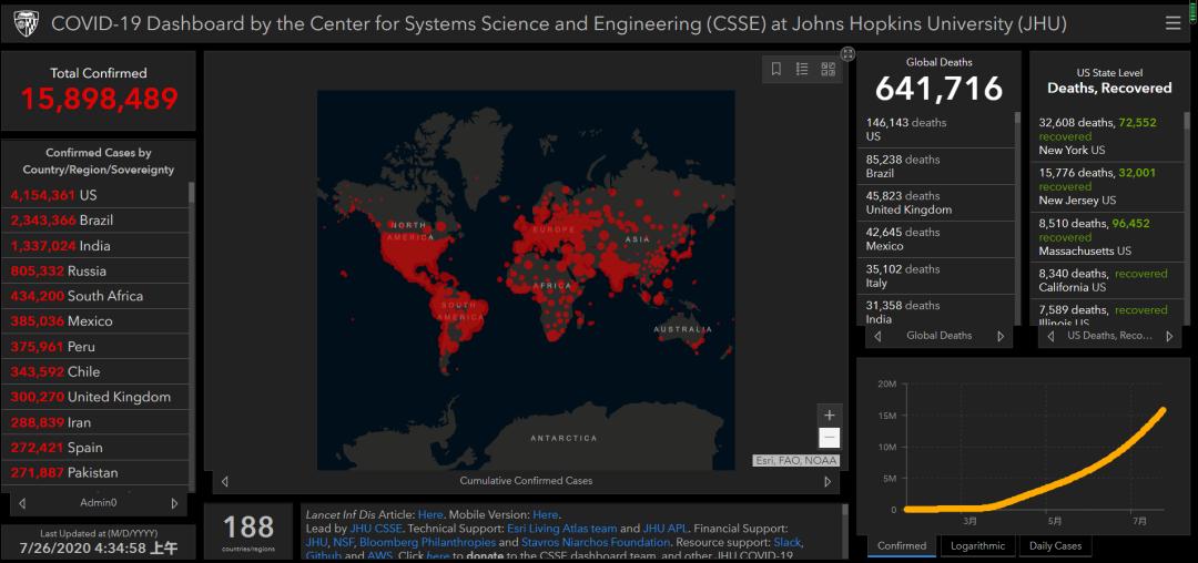 据美国约翰斯·霍普金斯大学实时统计数据,截至北京时间7月26日4时34分,全球新冠肺炎确诊病例累计15,898,489例,死亡641,716例。其中美国确诊超415万,巴西超234万,印度超133.7万,俄罗斯超80.5万,南非超43.4万,墨西哥超38.5万,秘鲁超37.5万,智利超34.3万,英国超30万,伊朗超28.8万,是全球确诊病例最多的10个国家。