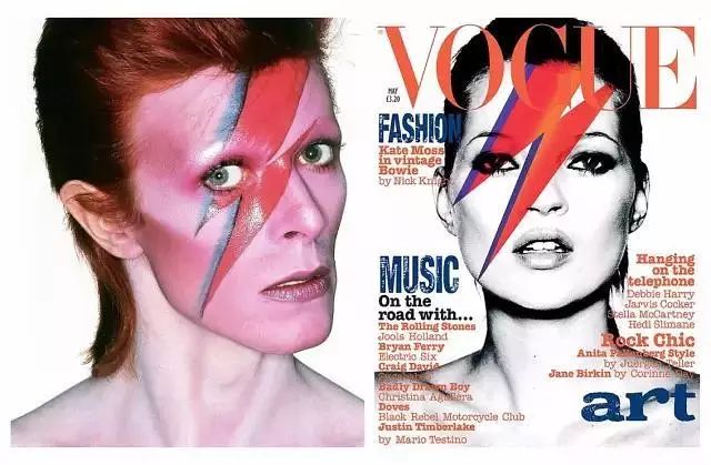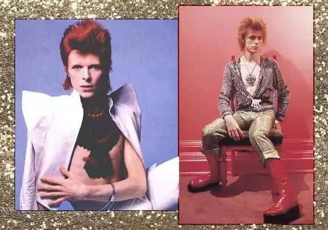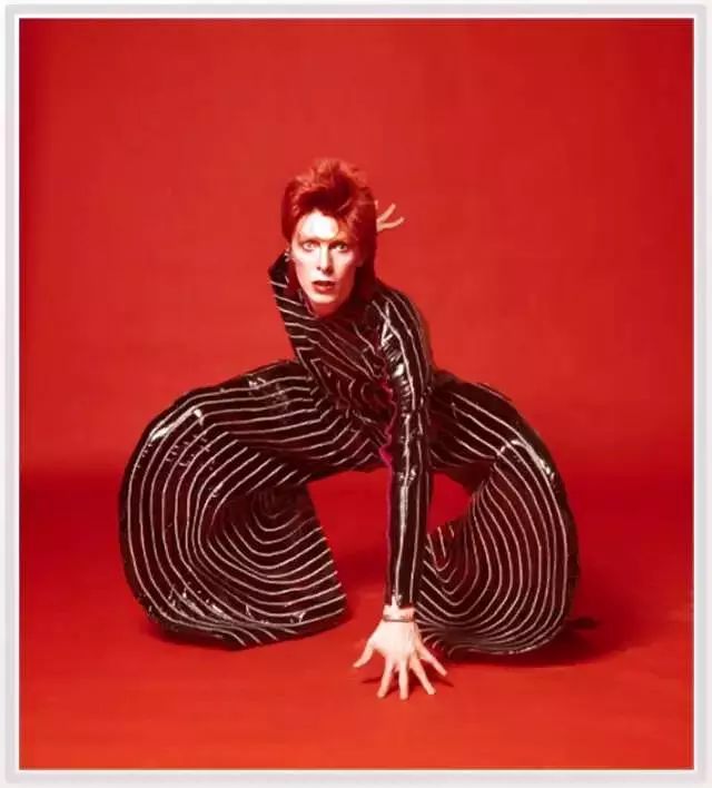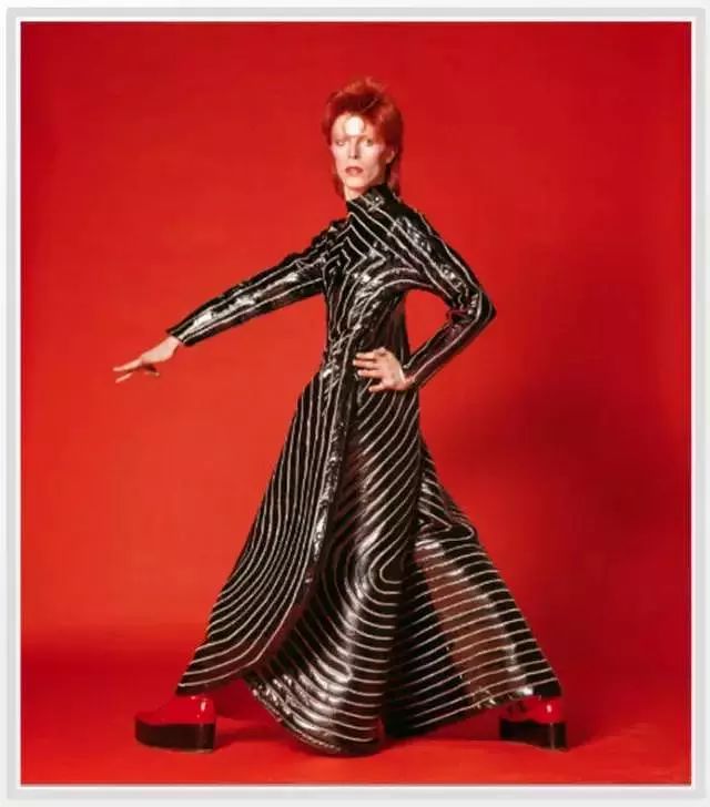 他的标志性橘色长发,紧身裤,厚底鞋,让人雌雄难辨。在舞台上,他可以是色彩缤纷的连身衣,踩着高跟鞋,名为“Ziggy Stardust”的一个中性外星怪物。而在现实中,他是“无性别”的时尚先锋,他创造出的闪电妆、太阳妆被争相模仿。