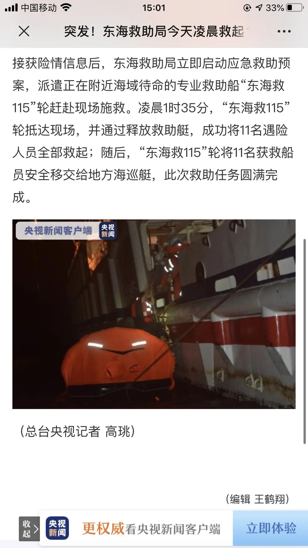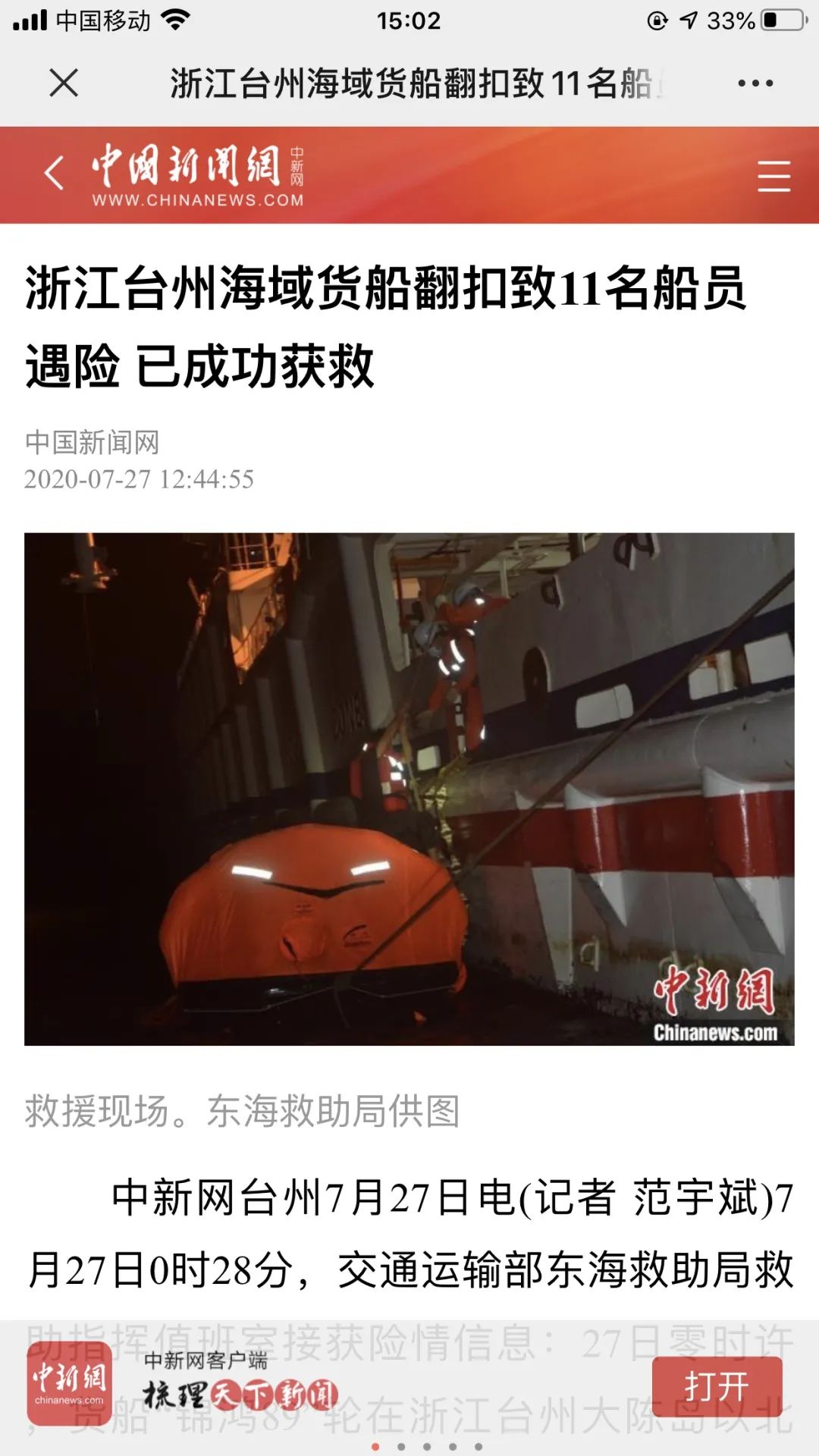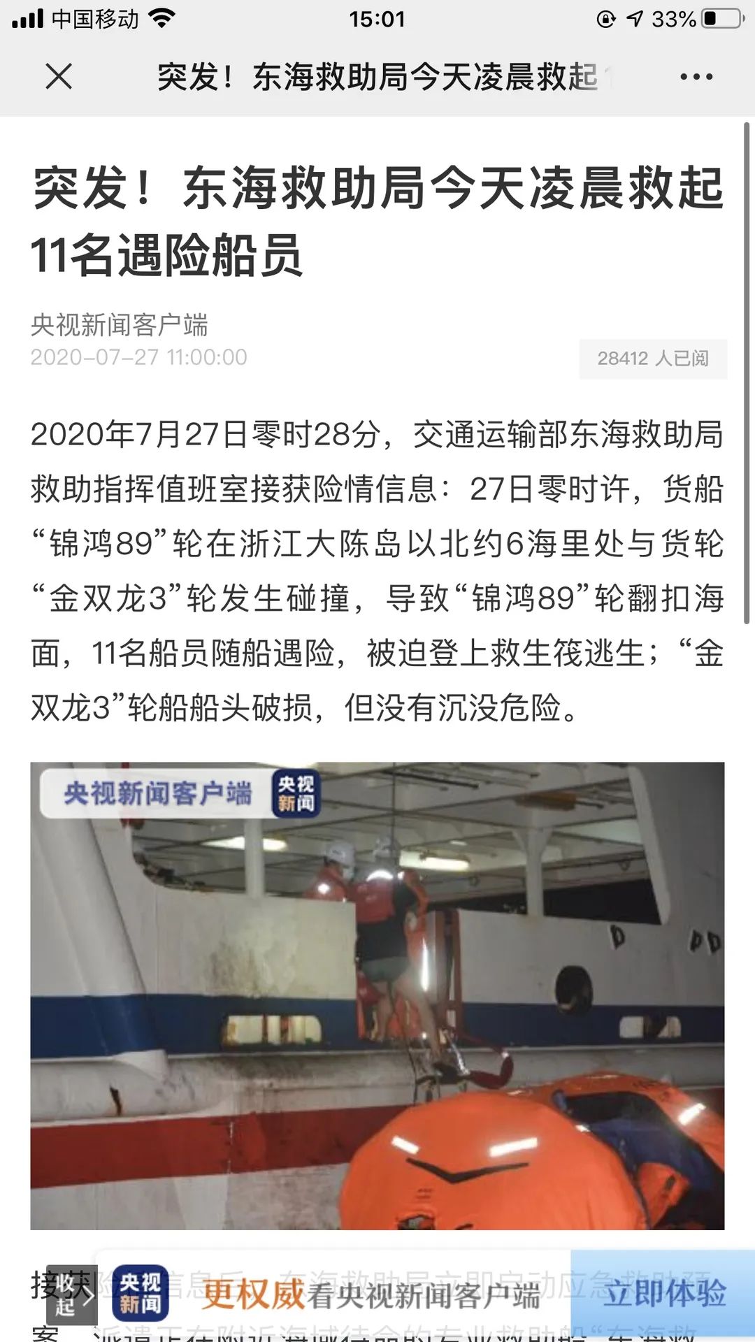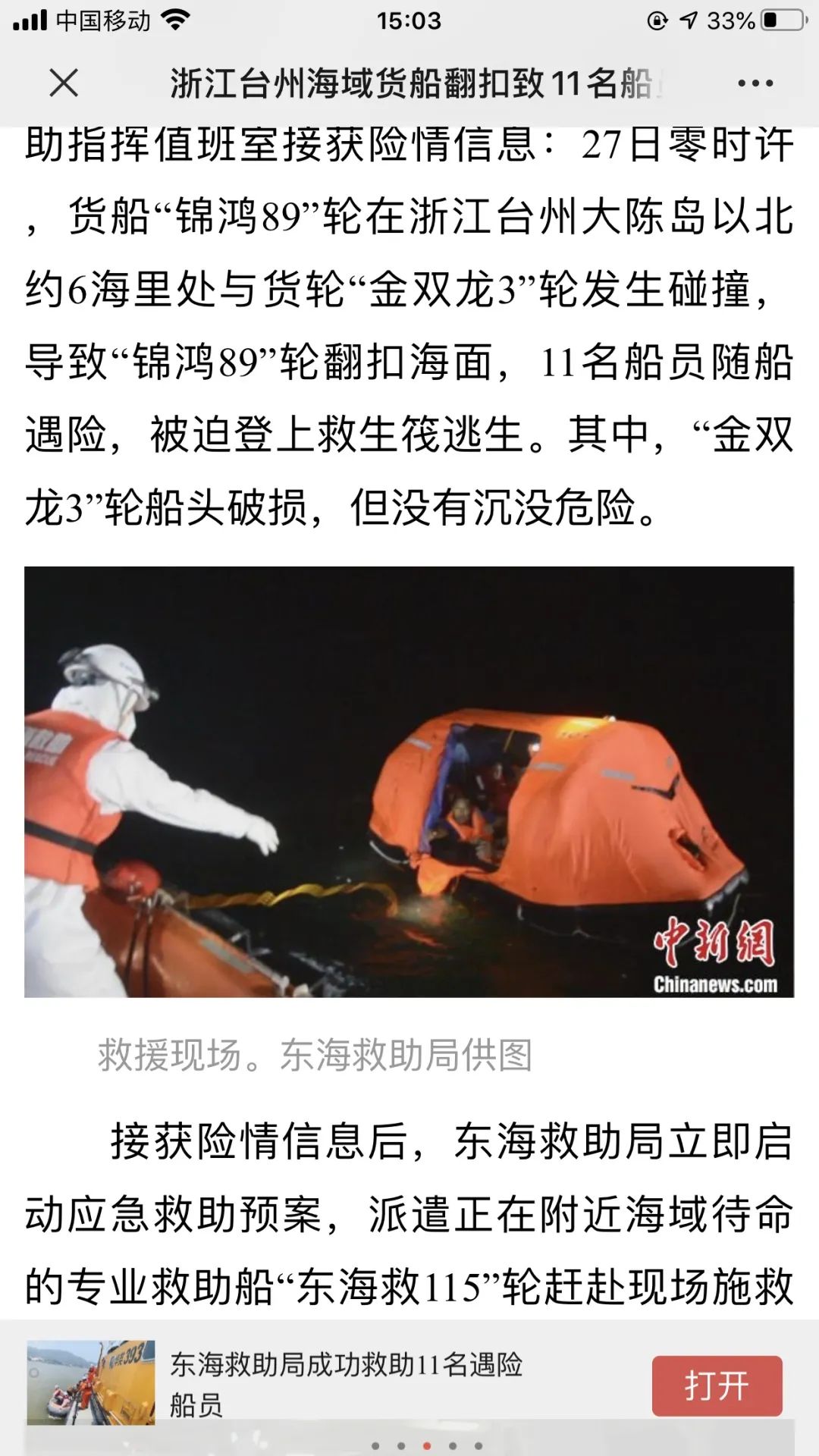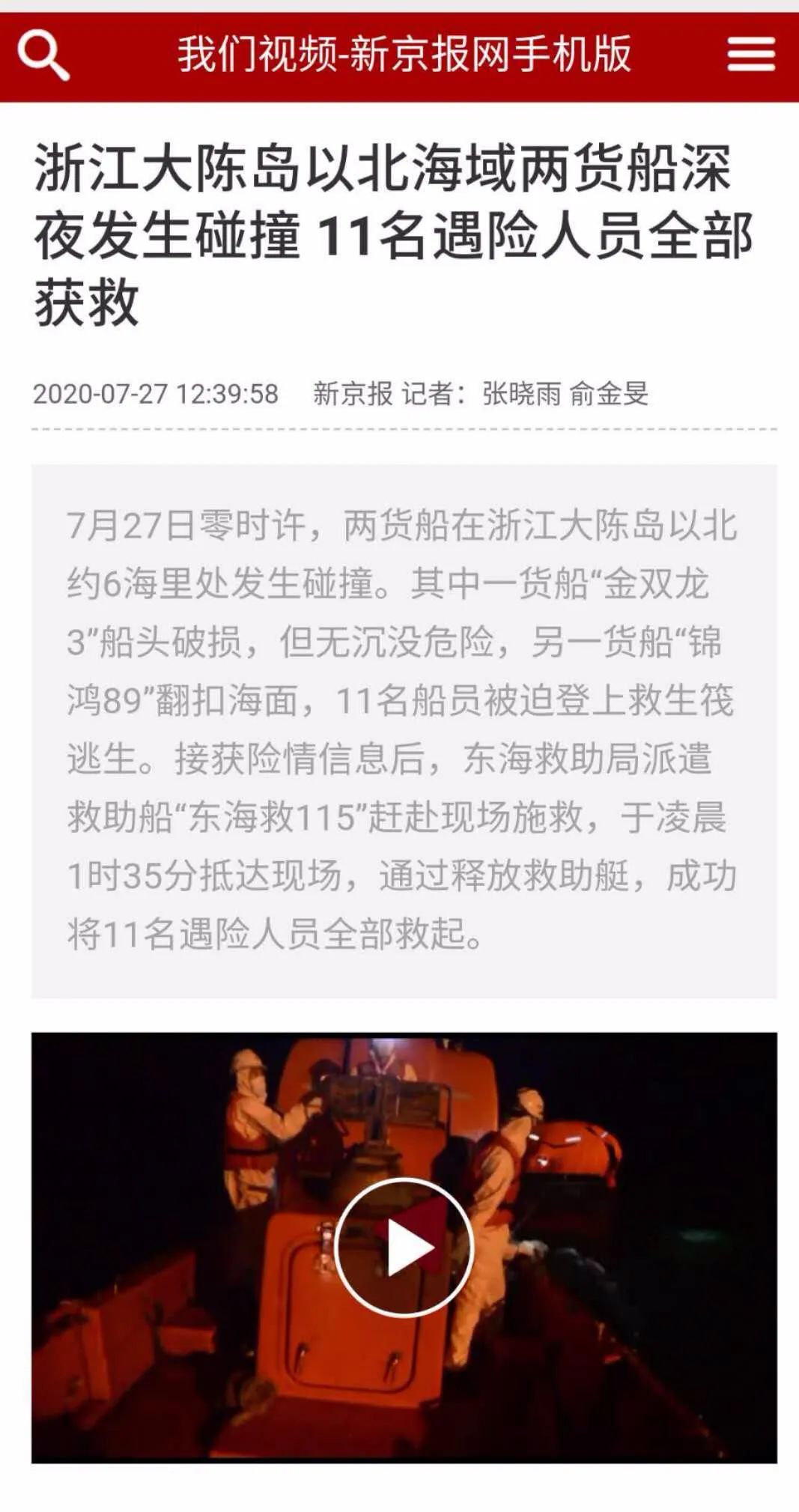 2020年7月27日零点28分,交通运输部东海救助局救助指挥值班室接获险情信息:27日零时许,货船“锦鸿89”轮在浙江大陈岛以北约6海里处与货轮“金双龙3”轮发生碰撞,导致“锦鸿89”轮翻扣海面,11名船员随船遇险,被迫登上救生筏逃生;“金双龙3”轮船头破损,但没有沉没危险。救助 · 回顾视频来源:央视 《新闻直播间》接获险情信息后,东海救助局立即启动应急救助预案,派遣正在附近海域待命的专业救助船“东海救115”轮赶赴现场施救。凌晨1时35分,“东海救115”轮抵达现场,并通过释放救助艇,成功将11名遇险人员全部救起;随后,“东海救115”轮将11名获救船员安全移交给地方海巡艇,此次救助任务圆满完成。媒体 / 关注原标题:《东海救助局所属“东海救115”轮凌晨出动,在浙江台州水域成功救助翻扣货船“锦鸿89”轮上11名遇险船员》