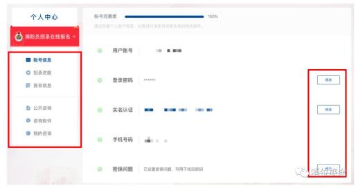 在个人中心可维护账号信息、查看招录进展、编辑报名信息和提交咨询投诉。