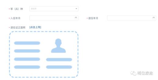报名类型为“退役士兵”的招录对象需填写服役的军(兵)种、入伍时间、退役时间(具体到年月),系统自动计算服役年限,同时还须上传退伍证带有个人照片和信息的正面照。军(兵)种分为解放军和武警部队、原公安消防部队、原武警森林部队。