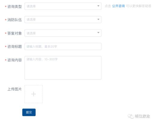 系统注册人员可在【咨询投诉】中提问,提问需填充的内容包括咨询类型、消防队伍、答复对象、咨询标题、咨询内容,还可上传说明图片。需先选择“消防队伍”才可选择“答复对象”。