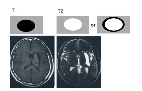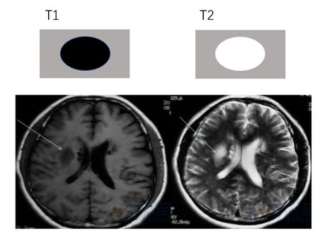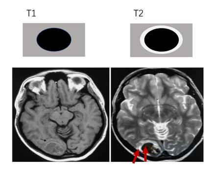 急性期红细胞的细胞膜保持完整,细胞内的氧合血红蛋白释放出氧变成脱氧血红蛋白。此期,T1WI上信号变化不明显,T2WI上表现为低信号。血肿周围的水肿在MRI上表现为T1WI低信号,T2WI较高信号。