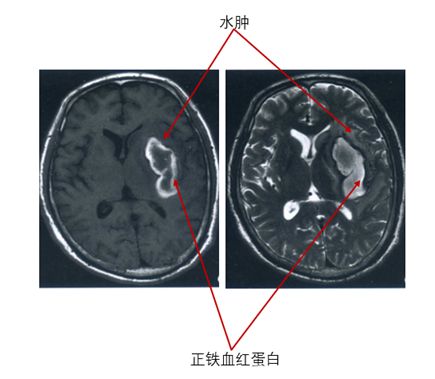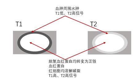 血液刚从动脉里流出来,红细胞是完整的,内含氧合血红蛋白,最“原汁原味“。超急性期尚未凝固的血液表现出血液在磁共振检查中长T1长T2特性,即T1WI上表现为略低信号,在T2WI上呈现高信号。超急性期3小时后可出现血肿周围水肿。