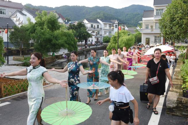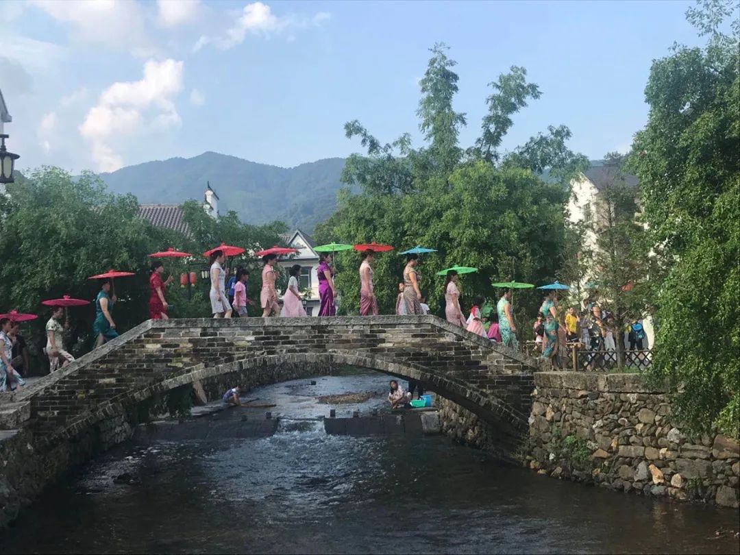撑一把油纸伞,着一袭锦旗袍,30多名精心梳妆打扮的女子,沿着清溪河,踏着石板路,在白墙黛瓦马头墙的徽派建筑间走着不紧不慢的小碎步。轻盈的步伐、妙曼的身姿,引得村民和游客驻足观赏。