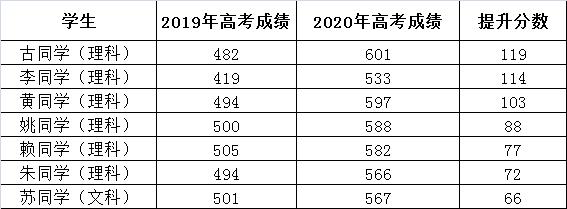 另外,2019届复读学生经黄广学校一年的学习指导,在2020年高考中也创出超越预期的显著提升,下图是部分案例。