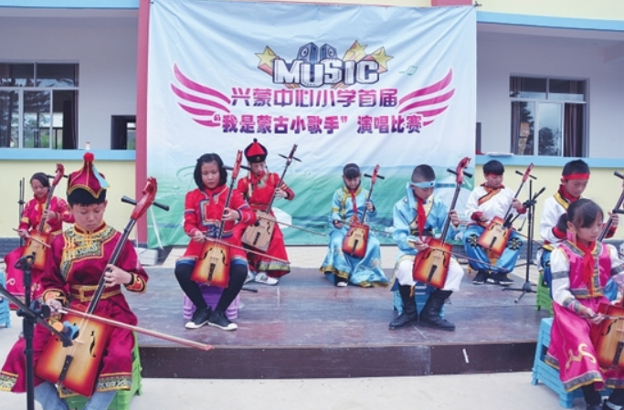三座蒙古包风格的文化体育活动室坐落在足球场旁,每一间教室门口都有蒙文、汉字两种文字书写的班级信息,水墨画风格、民族交融画卷呈现在操场的墙壁上,身穿蒙古族长袍的男孩和“三叠水”服饰的女孩在课间嬉戏玩耍……漫步在兴蒙乡中心小学,民族文化氛围十分浓厚。